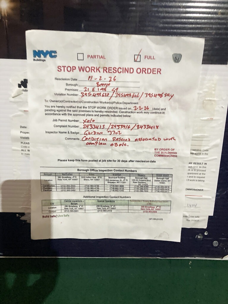 Maggiotto said that on Feb. 11, during a re-inspection of the construction site, the general contractor provided DOB with an approved Site Safety Plan and a valid new building permit. He said that the work site was not fully code-compliant, however, as various safety measures were not being maintained.