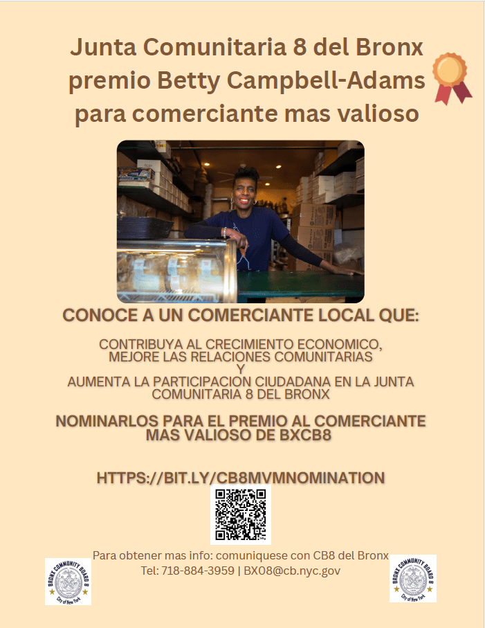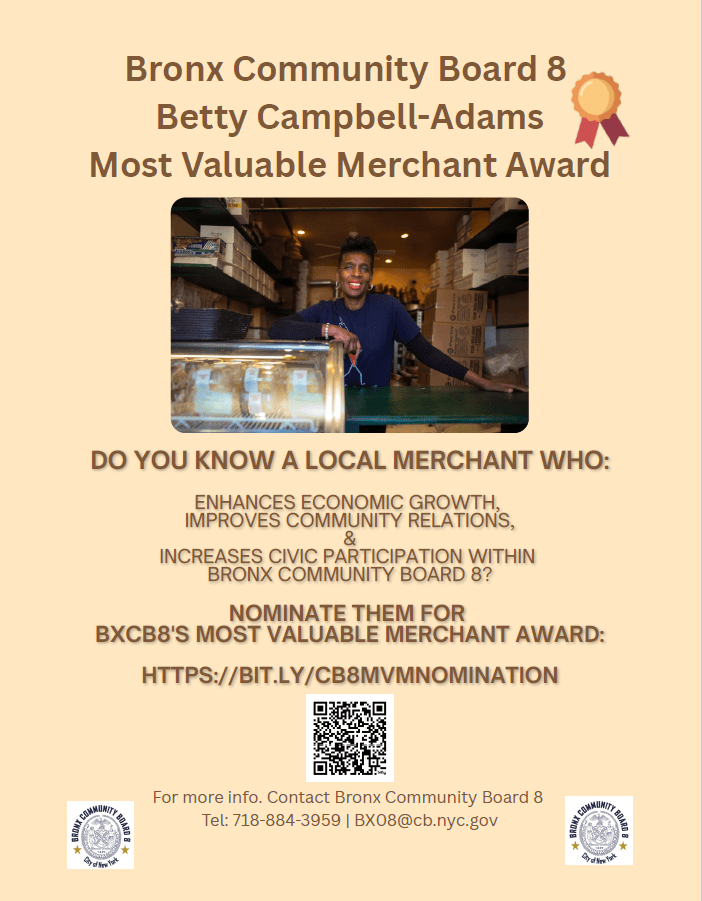 Bronx Community Board No. 8 (CB8) has announced that it is seeking nominations from businesses in Bronx Community District 8 for the Betty Campbell-Adams Most Valuable Merchant (MVM) Award. The board covers the Bronx neighborhoods of Fieldston, Kingsbridge, Marble Hill, Riverdale, Spuyten Duyvil, and Van Cortlandt Village.