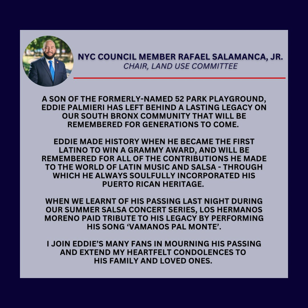 City Council Member Rafael Salamanca Jr. (C.D. 17), who represents much of the South Bronx, also released a statement, saying in part that Palmieri left behind a lasting legacy on the South Bronx community that will be remembered for generations to come. “When we learned of his passing last night during our summer salsa concert series, Los Hermanos Moreno paid tribute to his legacy by performing his song, “Vamanos pal Monte.” His full statement can be read above and the concert clip can be watched here, courtesy of the councilmember.