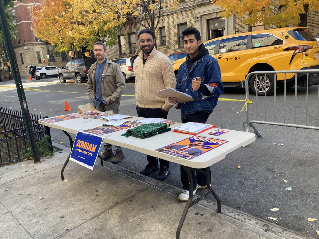 CAMPAIGN VOLUNTEERS FOR Democratic mayoral nominee and Queens Assemblyman Zohran Mamdani (A.D. 36), table outside the Islamic Cultural Center of the Bronx, at 371 E 166th Street north of the Melrose section of The Bronx on Friday, Oct. 24, 2025.