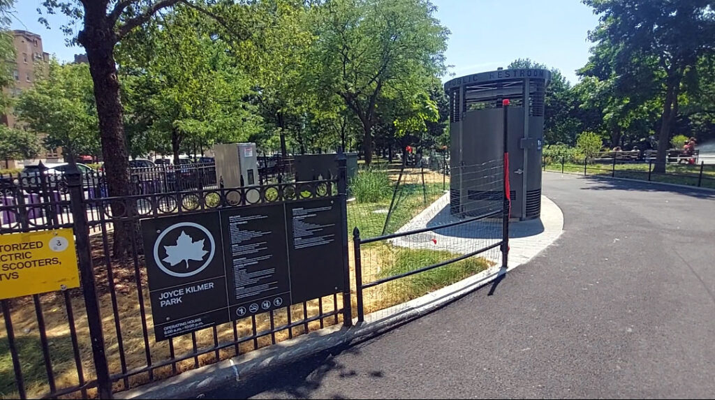 One unidentified woman visiting Joyce Kilmer Park the same day said of the new restroom, “It’s really nice.” When we pointed out the angled louvers and informed her it was possible to look inside, she replied, “I know but nobody would do that.” When informed about the $1 million price tag, she concluded, “It’s okay because there’s no bathrooms around.”
