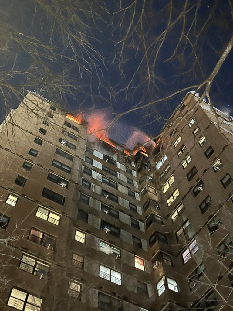 FLAMES ARE SEEN at the top of Boston Secor Houses, a NYCHA complex in the Eastchester section of The Bronx, early on Saturday morning, Jan. 24, 2026.