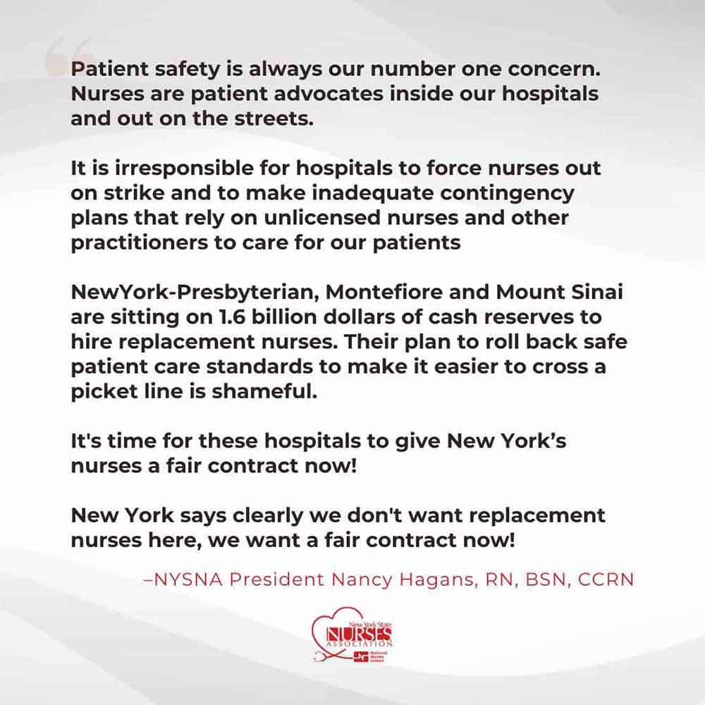 Nurses at Mount Sinai and New York Presbyterian private hospital systems, who are also members of New York State Nurses Association (NYSNA), are also striking, as reported.