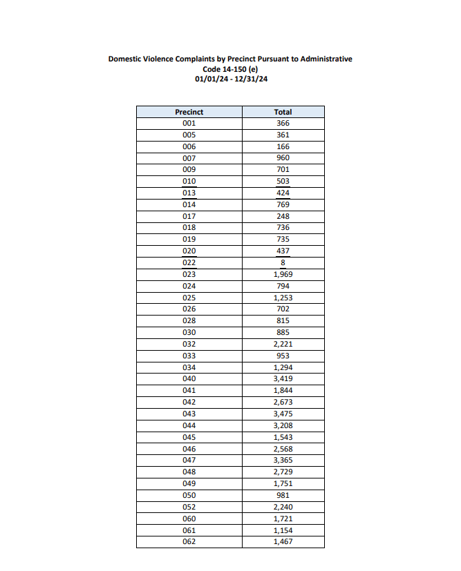 Domestic violence complaints by precinct for the calendar year 2024 are attached. The 52nd Precinct covers some or all of Bedford Park, Fordham, Kingsbridge, Norwood, Bronx Park, and University Heights. The 50th Precinct covers some or all of Kingsbridge, Fieldston, Riverdale, Marble Hill, and Spuyten Duyvil. The 46th Precinct covers covers some or all of Fordham, University Heights, Morris Heights and Mt. Hope.