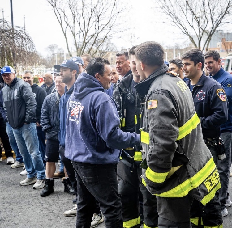 FIREFIGHTER LAURIE GALIOTO from Ladder Company 37 is discharged on Thursday, April 2, 2026 from Jacobi Medical Center in Morris Park and greeted by his co-workers after he was injured and hospitalized during a fire at the Company’s Bedford Park firehouse on Briggs Avenue on Thursday, March 26, 2026.