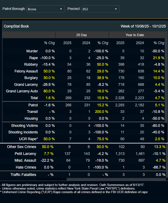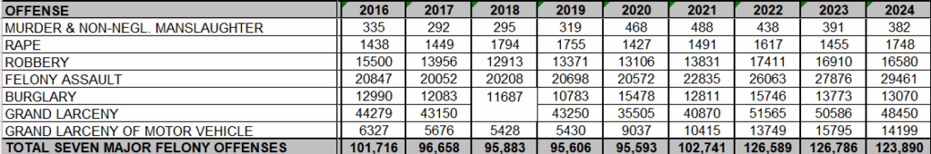 Editor’s Note: Citywide crime rates for the seven major felony offenses have actually continued to fall under the Adams administration, though crime is still clearly an issue, especially in certain areas of The Bronx. See attached historical citywide crime statistics attached below for various categories as well as the latest major crime statistics for the 46th, 50th, and 52nd Precincts.