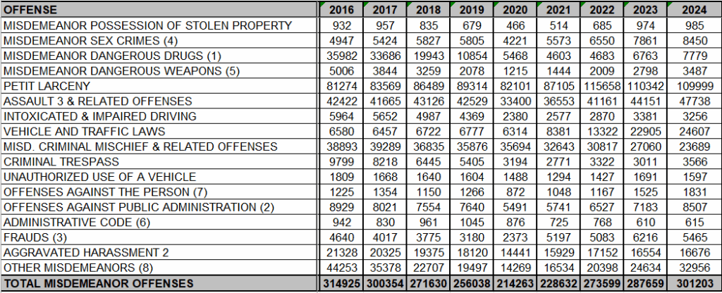 (4) Contains primarily the Penal Law offenses of Criminal Contempt 1, Reckless Endangerment 1 and Aggravated Harassment 1 as well as Other State Laws (Tax Law, ABC, etc.)