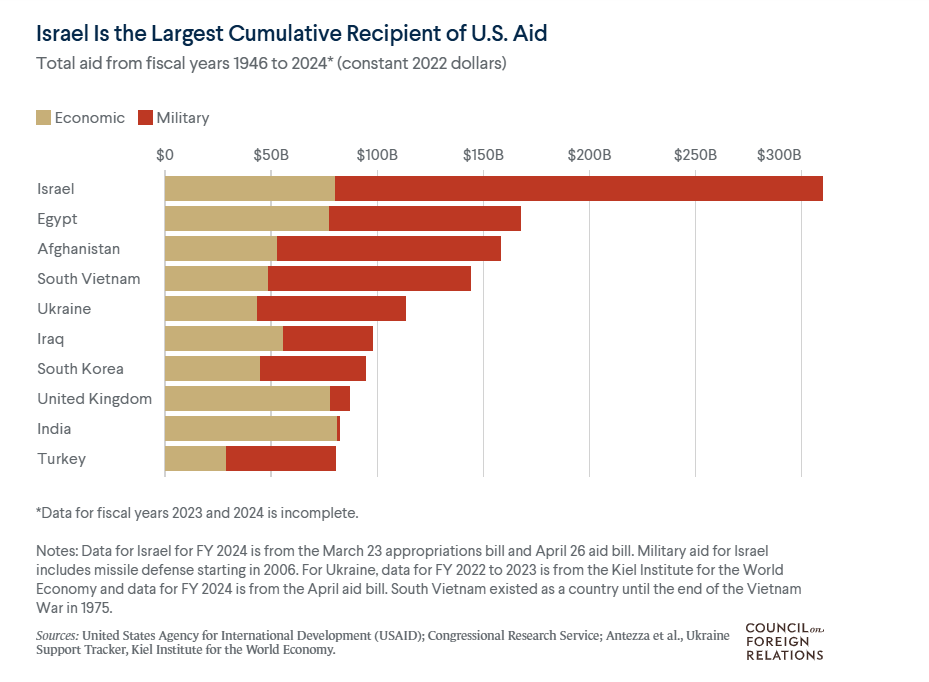 According to the United States government, it spent $6.8 billion in tax payer dollars / foreign aid for Israel in 2024. Accumulatively, the U.S. has spent $300 billion on Israel between 1946 and 2024. It spent $21.4 billion on Ukraine in 2024. On Aug. 7, the U.S. announced a full military takeover of Gaza.