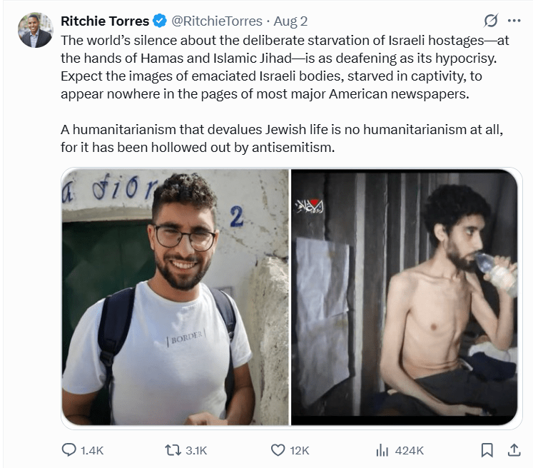 On Aug. 4, the congressman also tweeted, along with an accompanying NY Post article showing the emaciated body of an Israeli hostage, “Hamas has held Evyatar David captive for nearly 700 days. In a visibly starved and skeletal state, he was then forced to dig his own grave. Without a shred of shame, Hamas released video footage of its emaciated hostages, knowing full well that the world, so selective in its outrage, will respond with little more than thunderous silence.“