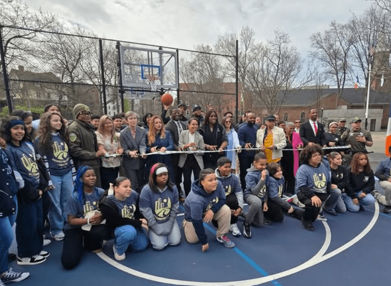 ELECTED OFFICIALS INCLUDING Council Member Pierina Sanchez (C.D. 14), Bronx Borough President Vanessa Gibson and representatives from local community based organizations, including Theory 9, joined Bronx Community Board 8 and local kids to mark the ribbon-cutting ceremony on the renovated Washington’s Walk Fort #4 basketball courts in Kingsbridge Heights, The Bronx on Monday, April 13, 2026.