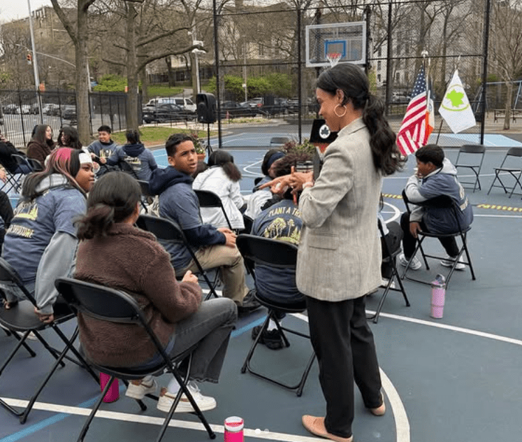 ELECTED OFFICIALS INCLUDING Council Member Pierina Sanchez (C.D. 14), pictured, Bronx Borough President Vanessa Gibson and representatives from local community based organizations, including Theory 9, joined Bronx Community Board 8 and local kids to mark the ribbon-cutting ceremony on the renovated Washington’s Walk Fort #4 basketball courts in Kingsbridge Heights, The Bronx on Monday, April 13, 2026.