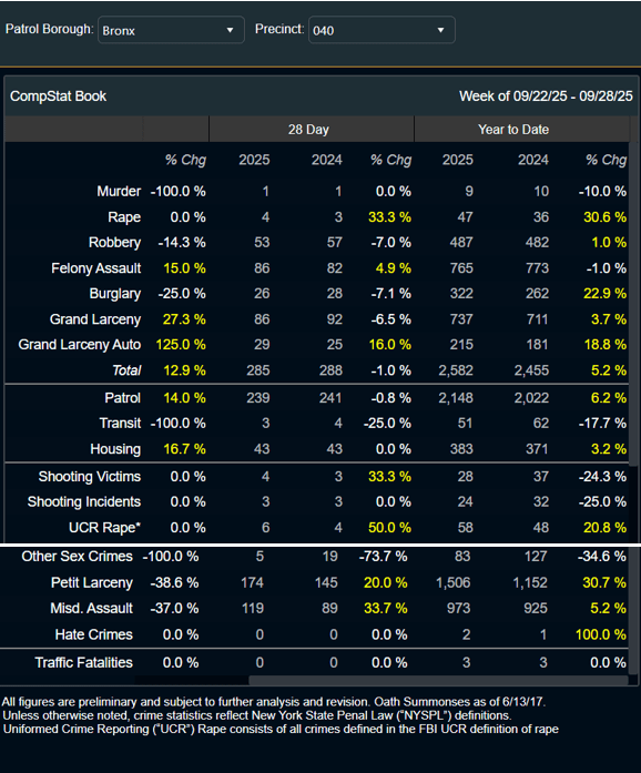 The latest major crime statistics for the 40th Precinct, which covers the neighborhoods of Port Morris, Mott Haven, and Melrose are attached below.