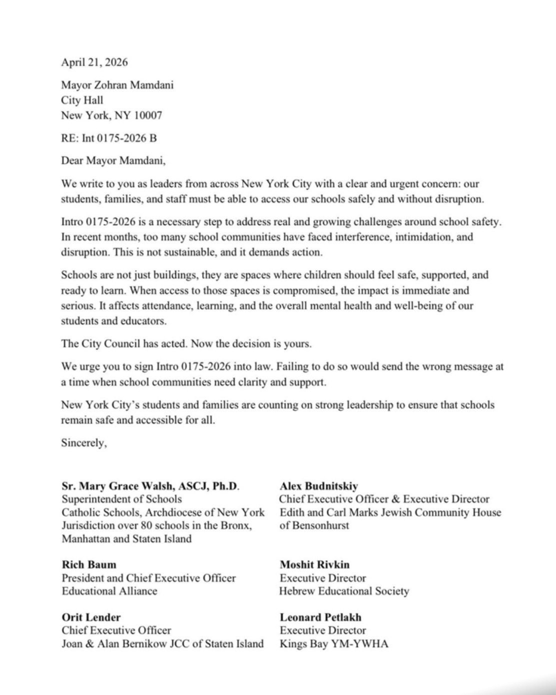 On April 21, a coalition of interfaith school leaders sent a letter to Mamdani urging him to sign Intro 0175b-2026 bill, saying, “Failing to do so would send the wrong message at a time when school communities need clarity and support.