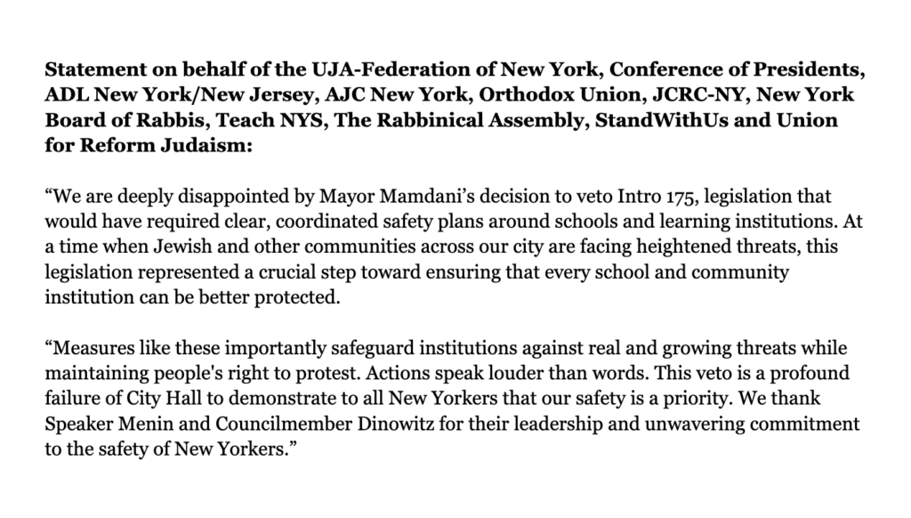 Additionally, the UJA-Federation of New York, Conference of Presidents, ADL New York/New Jersey, AJC New York, Orthodox Union, JCRC-NY, New York Board of Rabbis, Teach NYS, The Rabbinical Assembly, StandWithUs, and Union for Reform Judaism, also issued a joint statement, attached below.