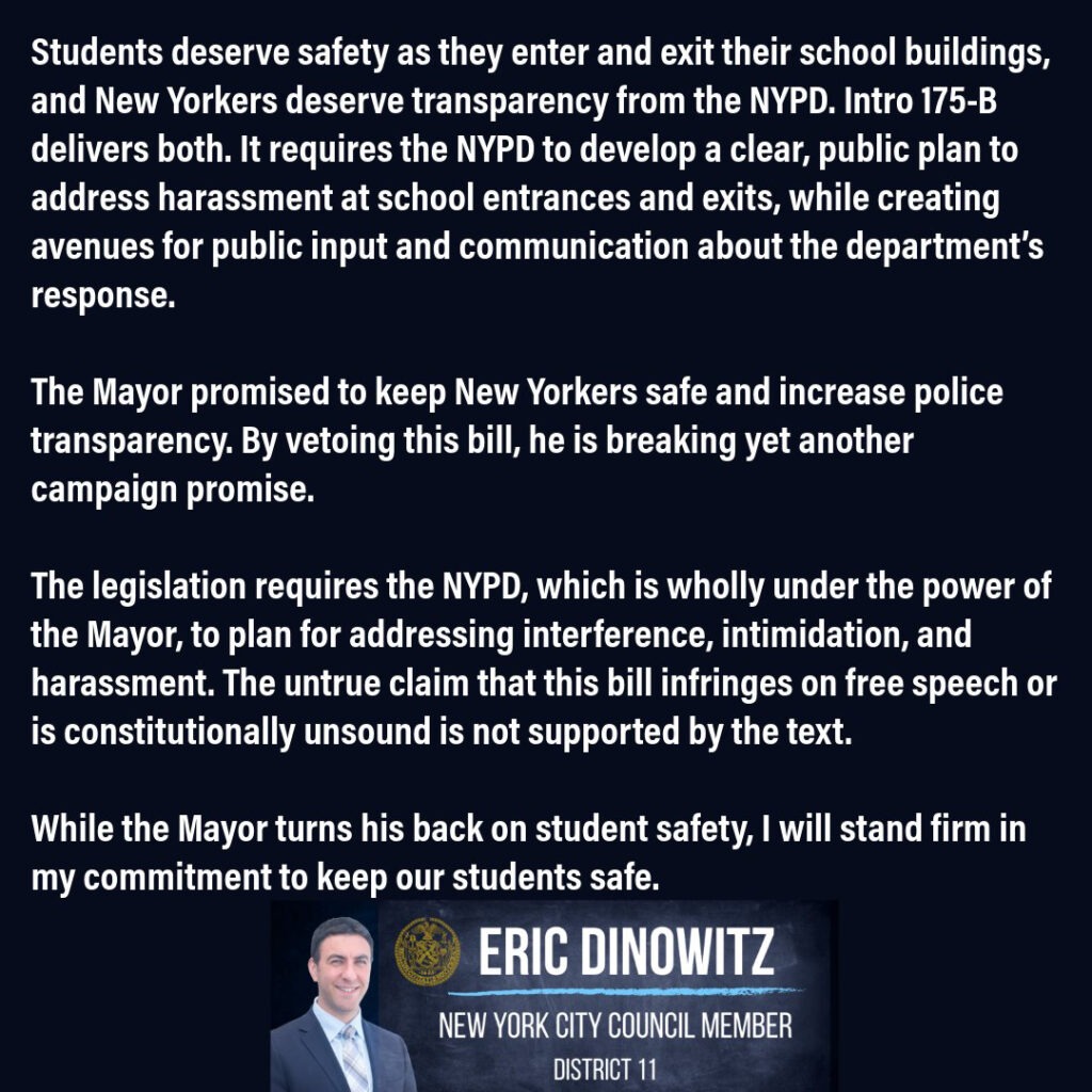 The councilman also issued a statement following the mayor’s veto, which is attached above. He has previously called for the need to curb racism in school settings. He has also been vocal about his support for former PSC-CUNY members who resigned over what was described as an anti-Semitic resolution. The councilman has, himself, been the target of at least one protest on Gaza in the Williamsbridge Oval park in Norwood, as reported.