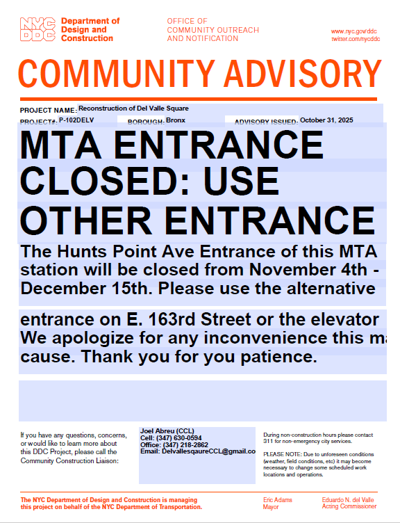 Additionally, the MTA has announced that the Hunts Point Avenue entrance of the Hunts Point MTA station serving the 6 train will be closed, though the station will remain open, from Nov. 4 until Dec. 15. MTA officials said customers should use the alternative entrance on 163rd Street or use the elevator while the Hunts Point Avenue entrance will be closed.
