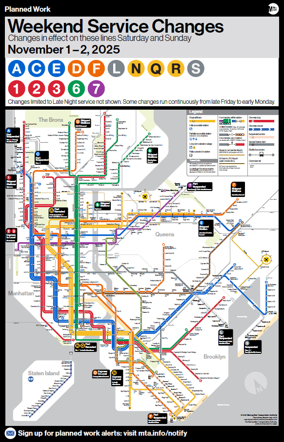 In terms of weekend changes to the subway schedule, MTA officials said that on Sunday, for the TCS New York City Marathon, some stairways at 59 Street-Columbus Circle A C D 1, 66 St-Lincoln Center  1, 72 St C, and 81 St-Museum of Natural History C may be closed, and there will be detours on many bus routes along the marathon route. If you’re taking the bus on Sunday, they recommend checking Planned Service Changes to see if there is a detour on your route.
