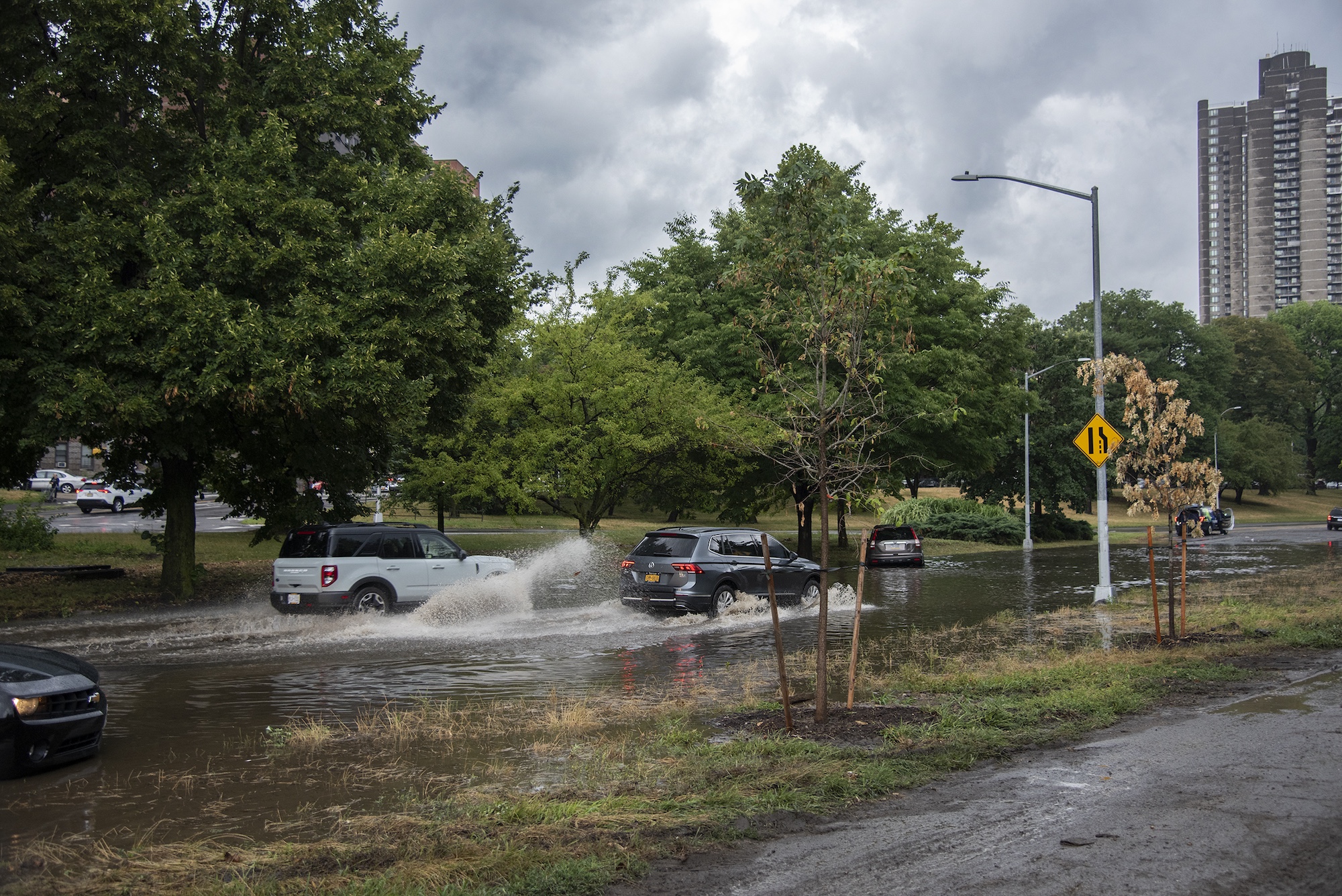 THE FLOOD WATERS from a series of thunderstorms did not stop these cars from attempting to drive north on Mosholu Parkway past an abandonded car in the far left lane on Monday, July 18, 2022.