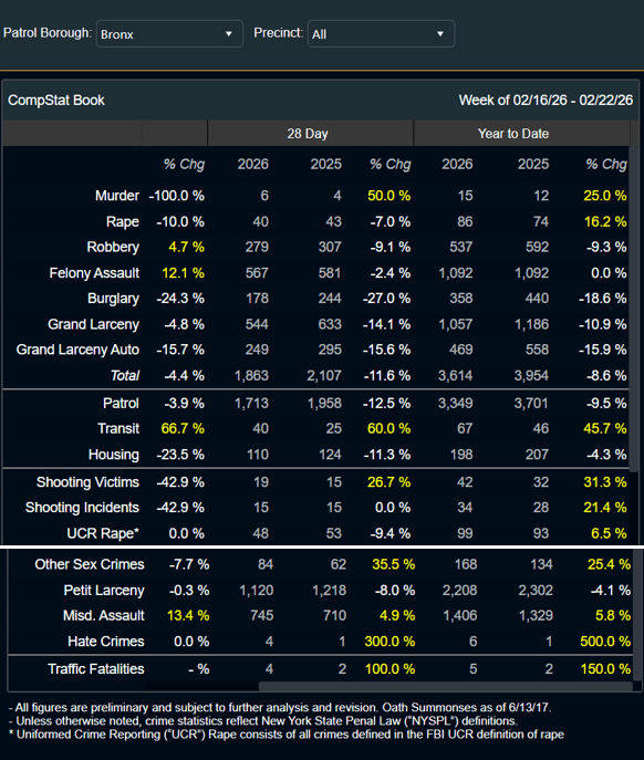 MAJOR CRIME STATISTICS for The Bronx for the 28-day period ending Feb. 22, 2026, compared to the same timeframe last year (left), and year-to-date major crime statistics for The Bronx as of Feb. 22, 2026, compared to last year (right).