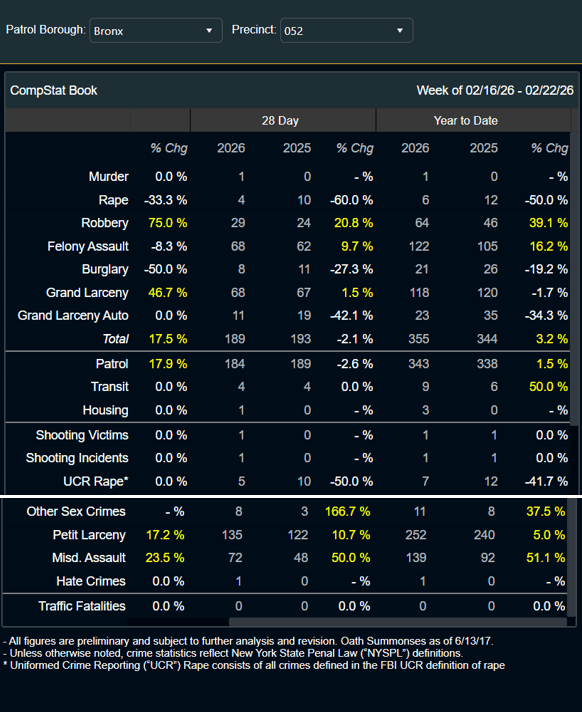 MAJOR CRIME STATISTICS for the 52nd Precinct for the 28-day period ending Feb. 22, 2026, compared to the same timeframe last year (left), and year-to-date major crime statistics for the 52nd Precinct as of Feb. 22, 2026, compared to last year (right). This precinct covers some or all of Bedford Park, Fordham, Kingsbridge, Norwood, Bronx Park, and University Heights.