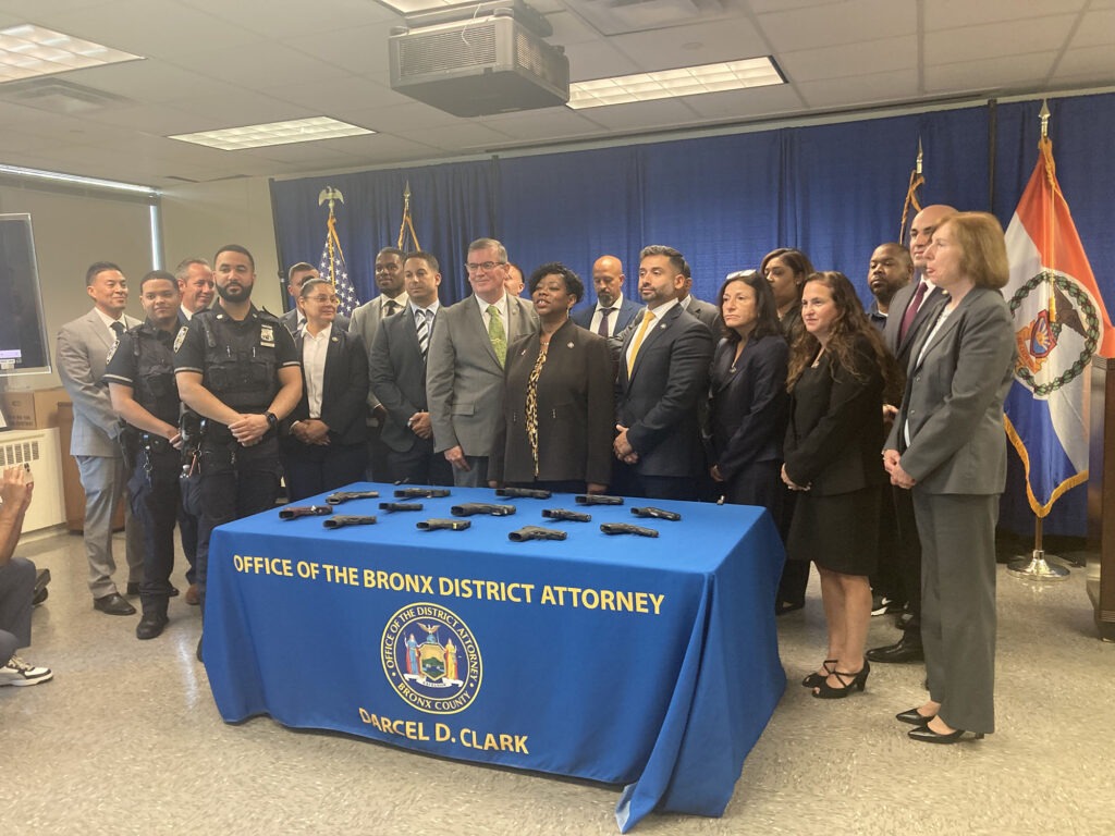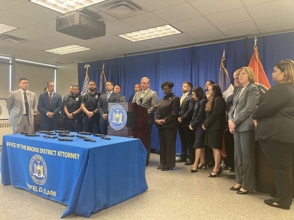 Clark said that between August 23 and Sept. 2, there were three deadly shootings in The Bronx, two of them mass shootings in which five people were shot. She said NYPD detectives from the 47th, 48th, and 49th Precinct Squads, along with the Bronx Homicide investigating the shootings recovered 13 guns: ten 9 mm pistols, two .45-caliber pistols, and a .380-caliber pistol.