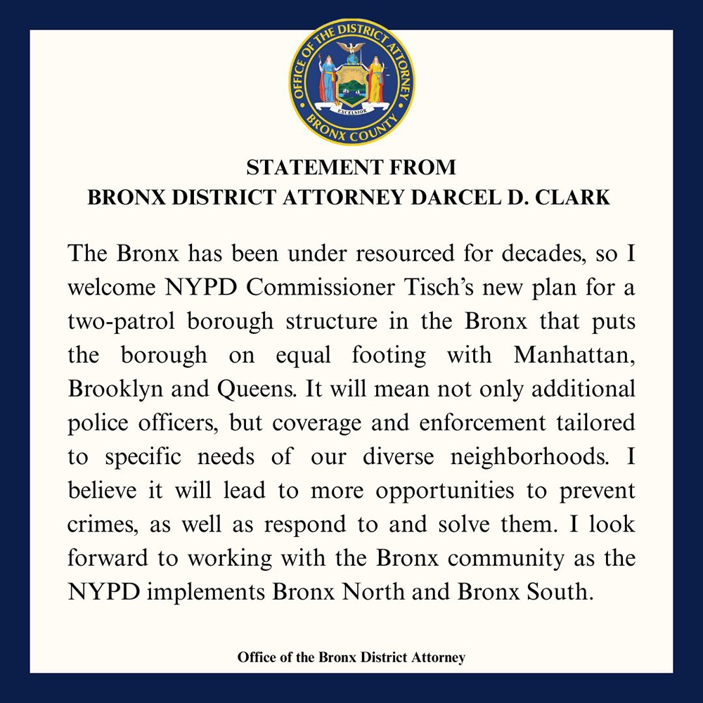 She said that currently, The Bronx is organized under a single patrol borough command, with one leadership structure overseeing every precinct, while Manhattan, Brooklyn, and Queens have each long since moved to two patrol borough commands to handle the volume of work there.