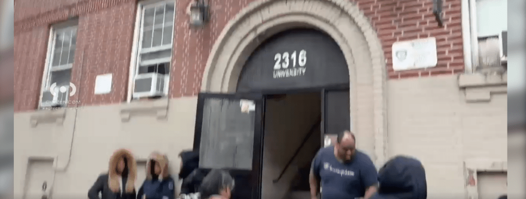 PEOPLE ARE SEEN on Thursday, April 2, 2026 outside 2316 University Avenue, located between West 183rd street and West Fordham Road in the University Heights section of The Bronx, after an e-bike fire broke out.