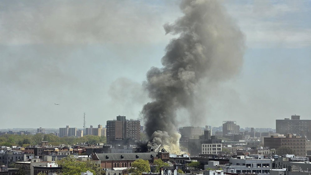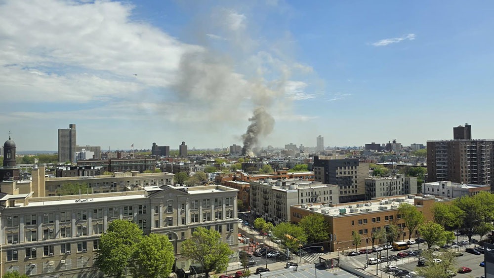 In photos taken as far away as Fordham Plaza on East Fordham Road and Third Avenue, a huge cloud of the same gray smoke is seen from a distance rising high into the sky over the building.
