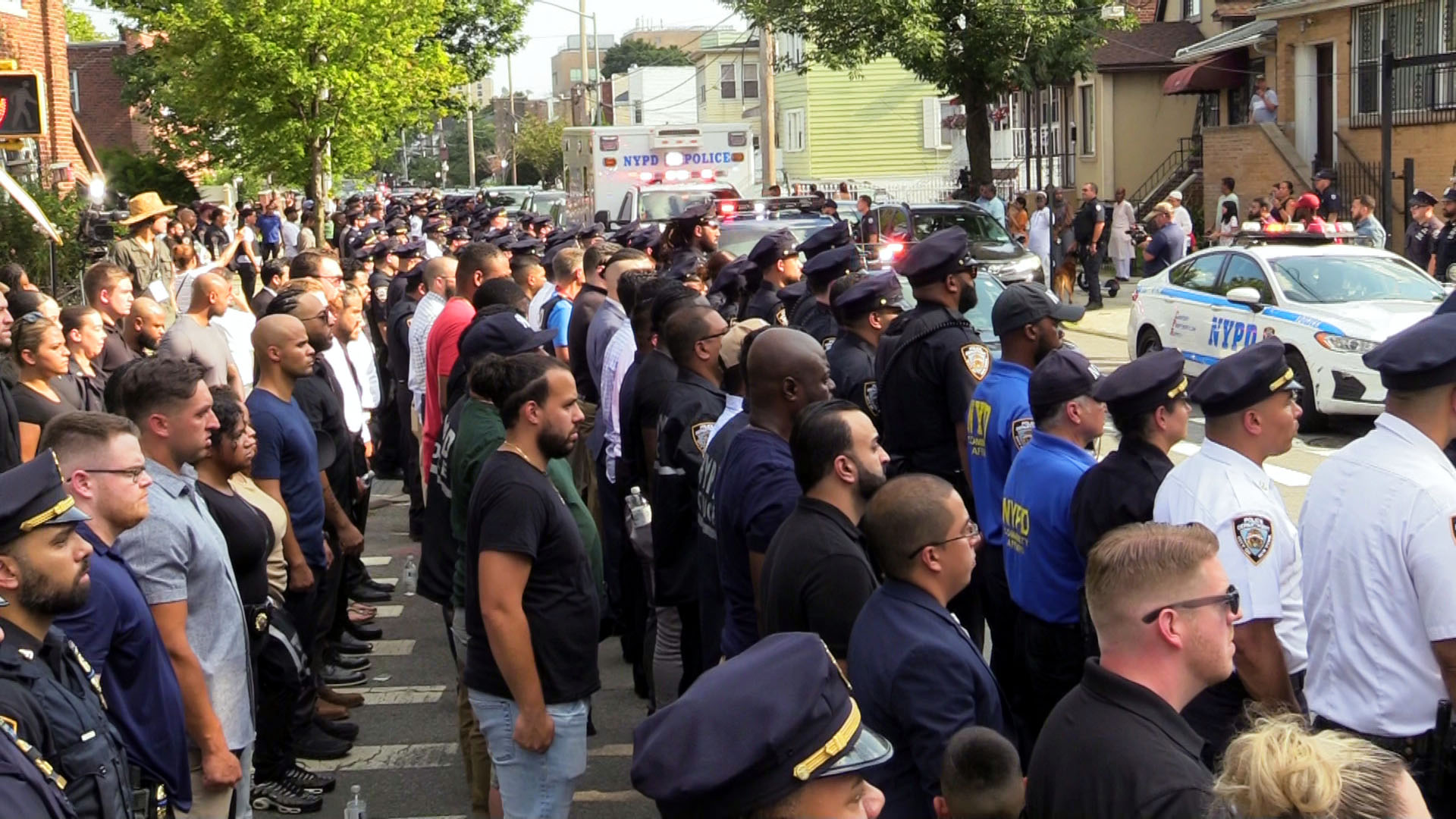 At least two heavily armed police officers stood guard in front of the mosque and were joined by an officer with a German Shepherd from the K-9 unit, while a contingent from the New York State Police also joined fellow officers in paying homage to the slain officer.