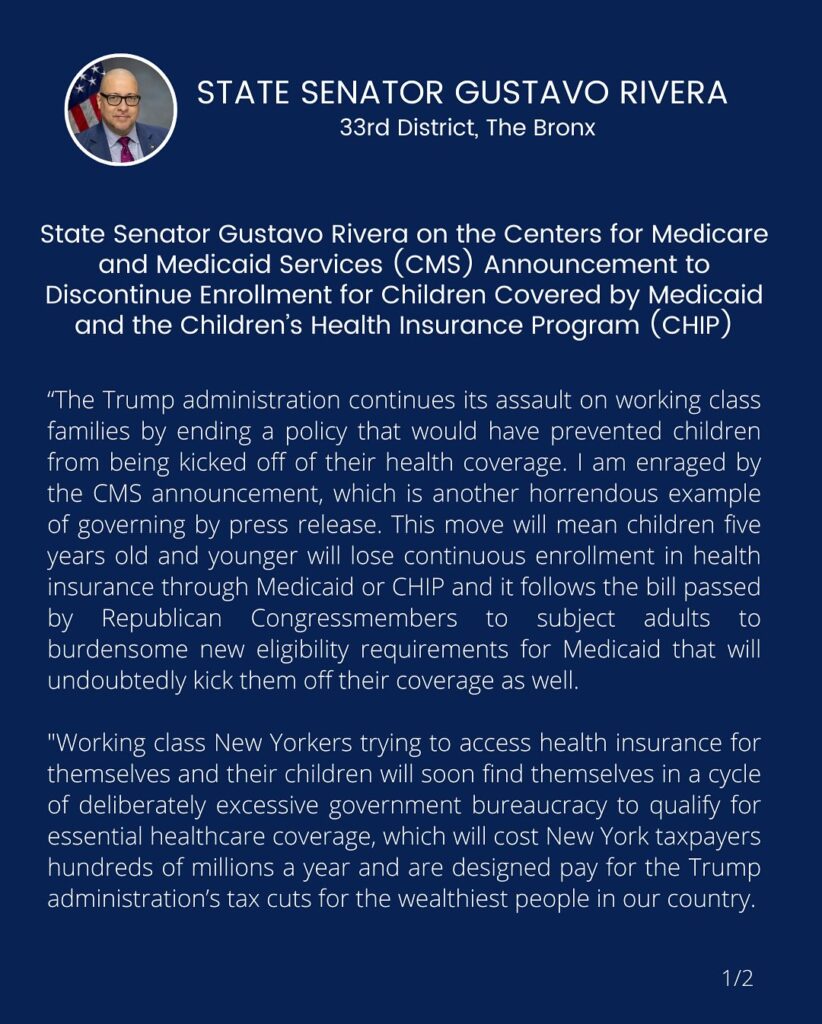 State Sen. Gustavo Rivera (S.D. 33) recently released the attached statement on the Centers for Medicare and Medicaid Services (CMS) announcement to discontinue enrollment for children covered by Medicaid and the Children’s Health Insurance Program (CHIP).