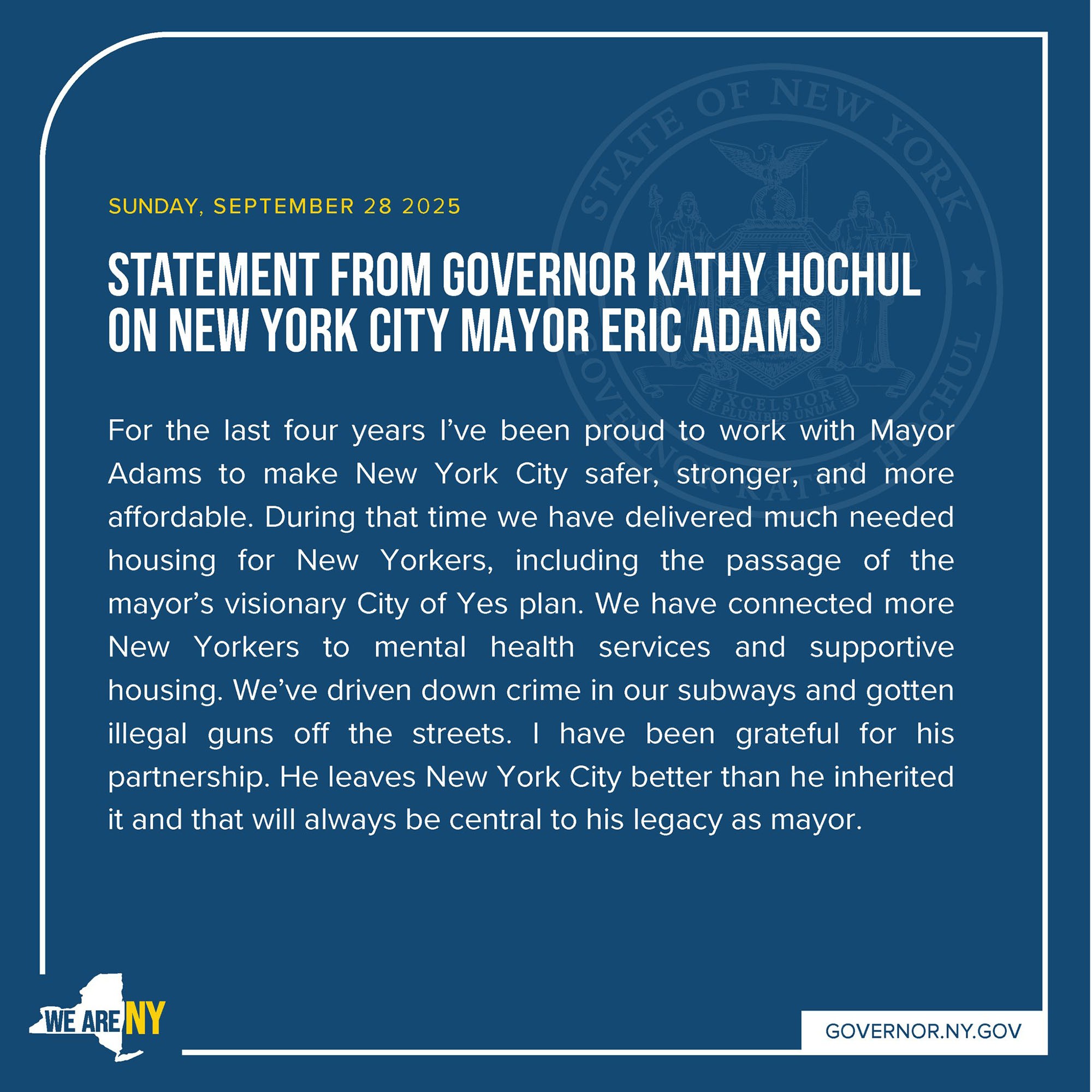 STATEMENT BY NEW York Gov. Kathy Hochul on New York City Mayor Eric Adams dropping out of the mayoral general election on Sunday, Sept. 28, 2025.