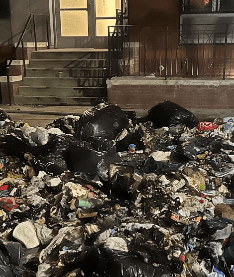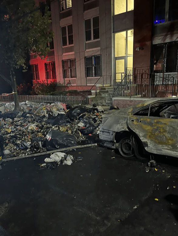 BURNED TRASH IS seen at 1000 Fox Street in the Longwood section of The Bronx on Wednesday night, Nov. 5, 2025.