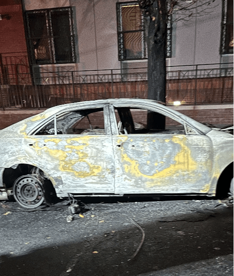 A BURNT OUT car and some burnt rubble is seen at 955 Westchester Avenue in the Longwood section of The Bronx on Wednesday night, Nov. 5, 2025.