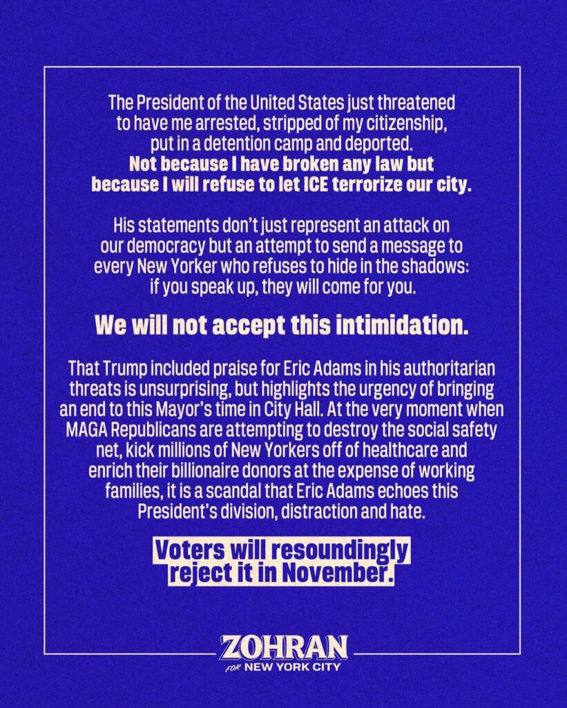 The president went on to defend Adams who he said had said that “New York City couldn’t have all these immigrants come in.” Trump added, “And like he was indicted the following day.” Mamdani responded with the attached statement (above).