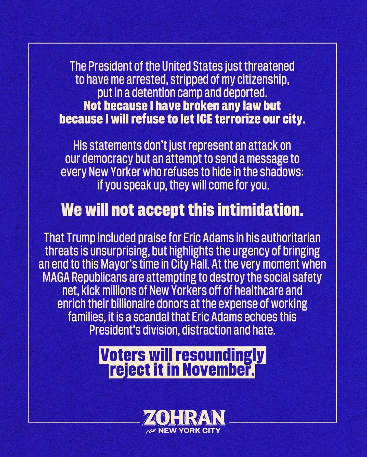 Former NYC Mayor Bill de Blasio shared Mamdani’s response and added, “Donald Trump will have to go through a lot of us first if he wants to arrest @ZohranKMamdani. We, New Yorkers, will put a human shield around him if we need to. No one gets to intimidate us.”