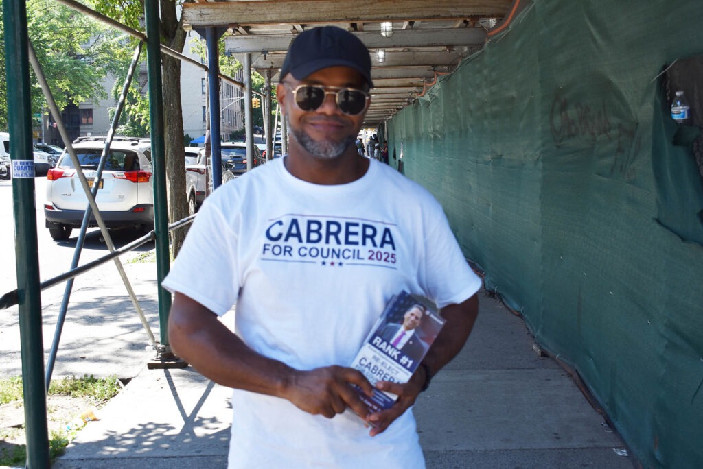 Speaking in Spanish, Julio Ventura said he was campaigning on behalf of former Councilman Fernando Cabrera for reelection to District 14. “He has 12 years’ experience and if we want a pilot with experience, we know that he’s the best one,” he said. “We also know that elections are very important because District 14 has deteriorated a lot in the last four years, and our candidate will turn things around.”