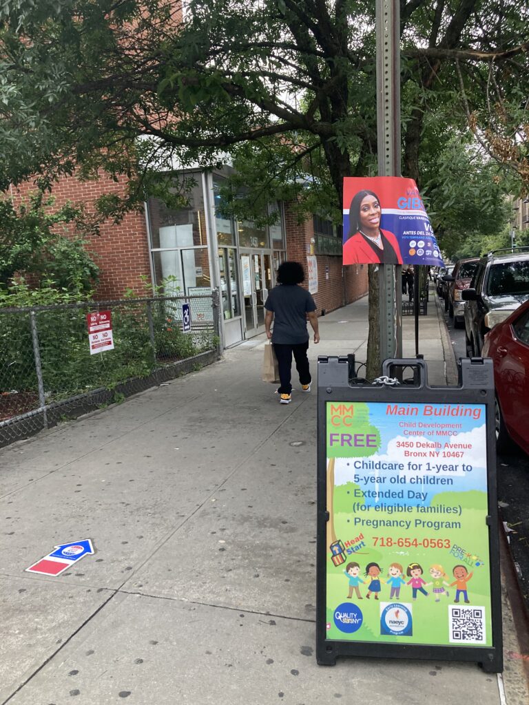 In other election-related news, after early voting had started, Norwood News witnessed a campaign poster for Bronx Borough President Vanessa Gibson affixed to a pole outside Mosholu Montefiore Community Center poll site on Dekalb Avenue in Norwood, which was located less than the required 100 feet from the poll site.