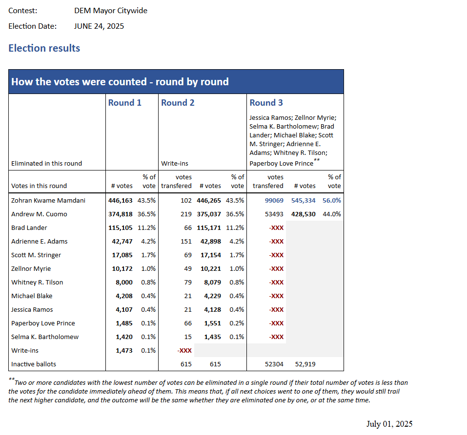 NYC Board of Elections (BOE) officials announced on Tuesday, July 1, that Queens Assemblyman Zohran Mamdani (A.D. 36), a Democratic socialist who attended the Bronx High School of Science, has extended his lead (56% to 44%) in the Democratic mayoral primary after Round 3 of ranked choice voting reallocations over Democratic top contender, Andrew Cuomo.