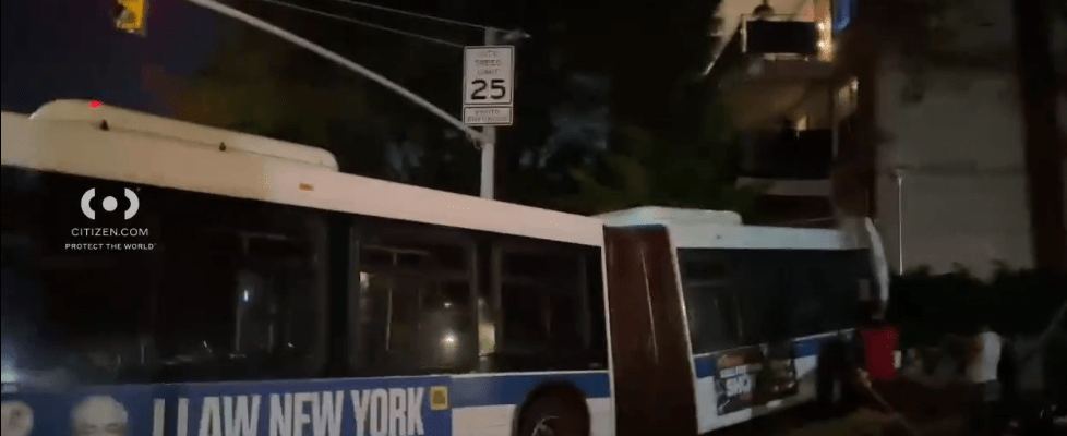 An MTA bus crashed into a retaining wall outside a residential building in the Mosholu section of The Bronx, east of North Riverdale, late on Monday night, Sept. 22, according to posts seen on the Citizens’ App.