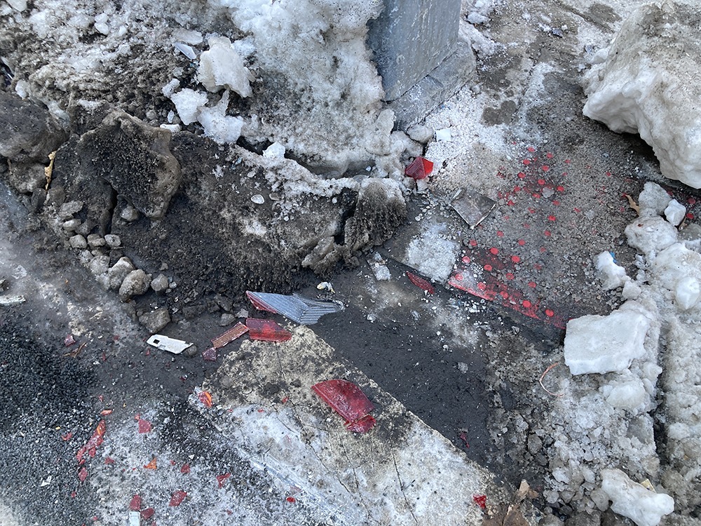 A video of the crash site as seen later on Sunday afternoon is below. Glass and other debris from the crash are seen scattered on the street, and a road sign on the medium is seen toppled over. It’s not yet known in which direction the vehicle was moving at the time of the accident.