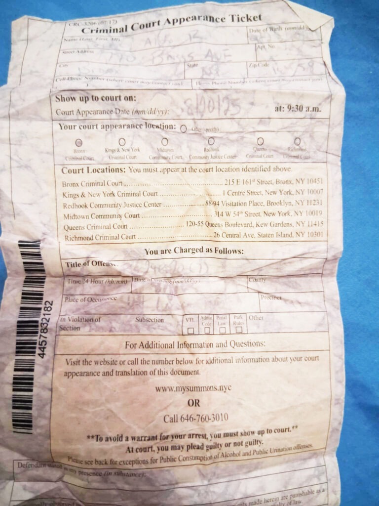 A PHOTO OF the criminal court summons Palestinian advocate Aldo Rafael Perez says he received after he was detained by NYPD officers on Friday, Aug. 1, 2025, after heckling Congressman Ritchie Torres during a memorial service outside of the 47th Precinct during a memorial service for slain NYPD Det. First Grade Didarul Islam.