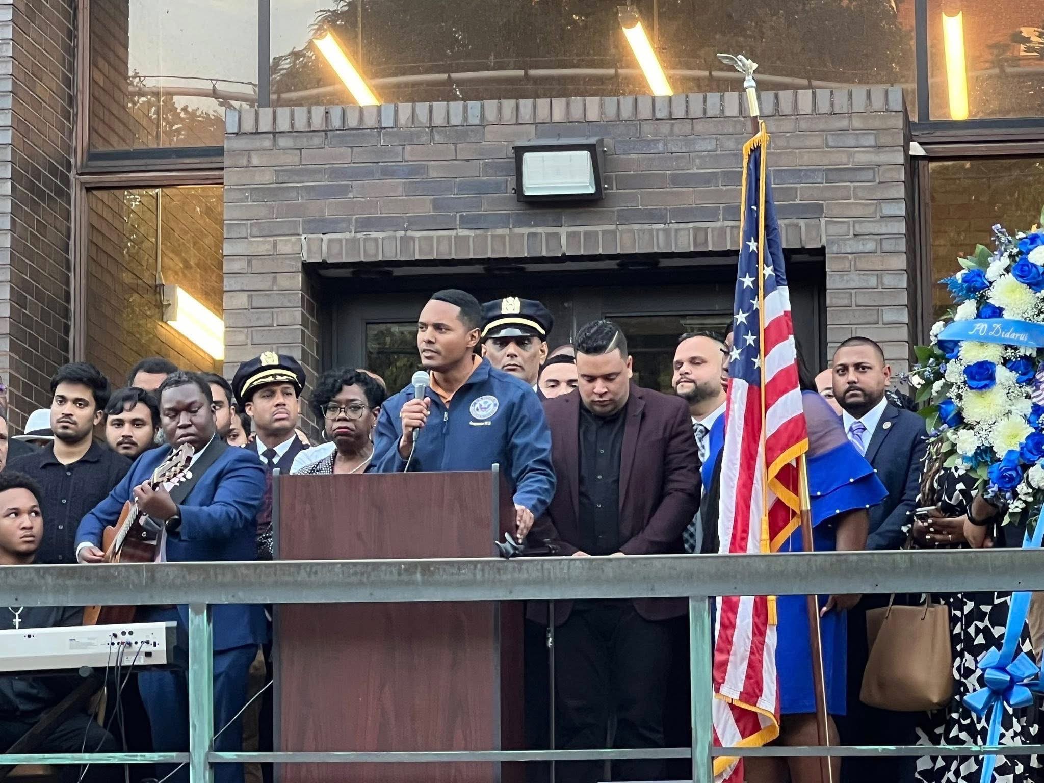 ELECTED OFFICIALS ADDRESS those gathered outside the 47th Precinct in Wakefield for a memorial service on Aug. 1, 2025, honoring NYPD Det. First Grade Didarul Islam who was killed in a mass shooting on July 28, 2025 in Midtown Manhattan along with three other victims. The gunman then killed himself.