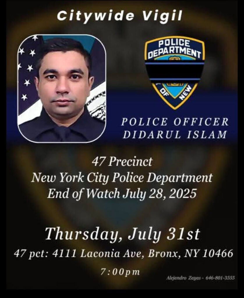 Meanwhile, members of the 47th Precinct wrote of how they had stood alongside family, friends, and community members during the candlelight vigil to honor Islam and that white balloons were released in a solemn tribute to his life and service. “His courage, dedication, and sacrifice will never be forgotten,” they wrote. As reported, Islam’s wife, Jamila Islam, gave birth to the couple’s third son, Arham Islam, on Sunday, Aug. 17.