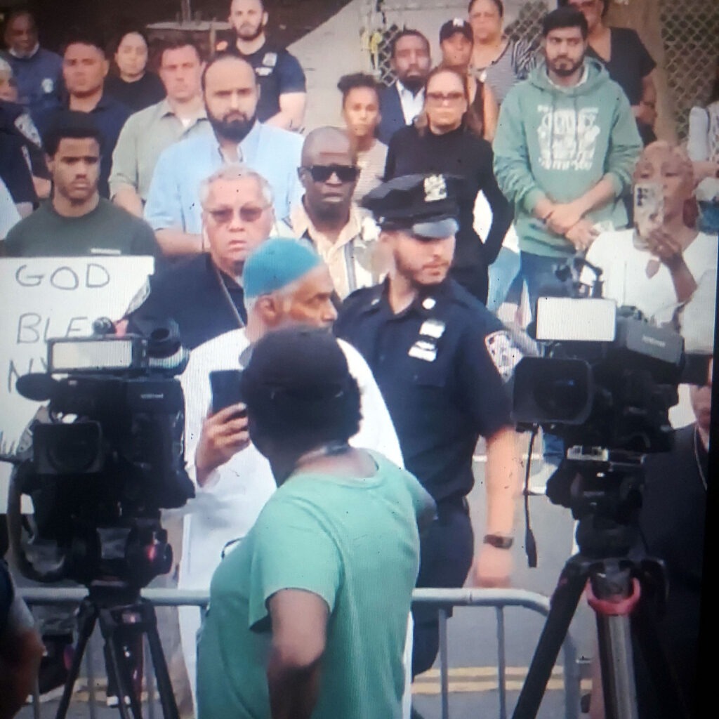 In a video (Video 1) of the subsequent Aug. 1 vigil posted live to social media, longtime Bronx community activist and Puerto Rican Muslim Aldo Rafael Perez is heard at the event angrily commenting throughout most of the congressman’s remarks as he stands facing the elected officials behind a police barricade that had been placed between members of the public and members of the media.
