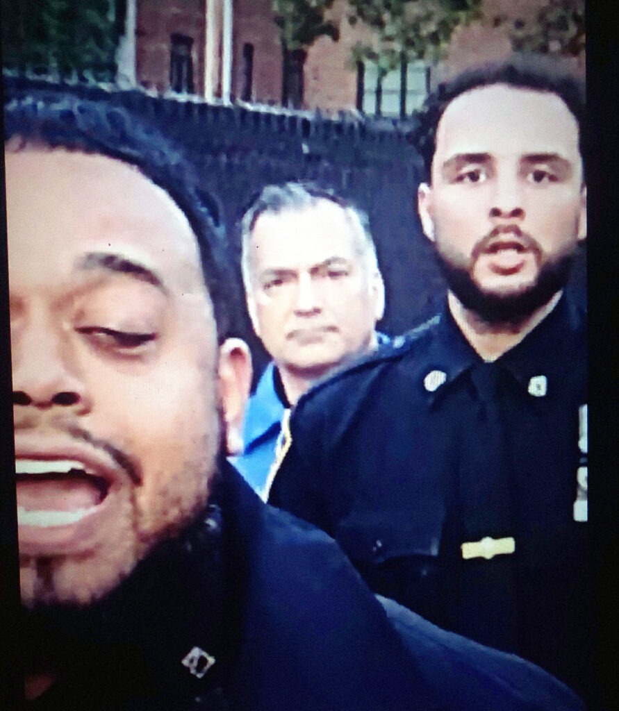 In another video (Video 2) shared with Norwood News by another source who declined to be identified, at one point, a uniformed police officer is seen approaching Perez and appears to grab him as Torres is simultaneously heard almost shouting, “We should thank them [police] for their service and their sacrifice because public safety and those entrusted with protecting it should never be taken for granted.”