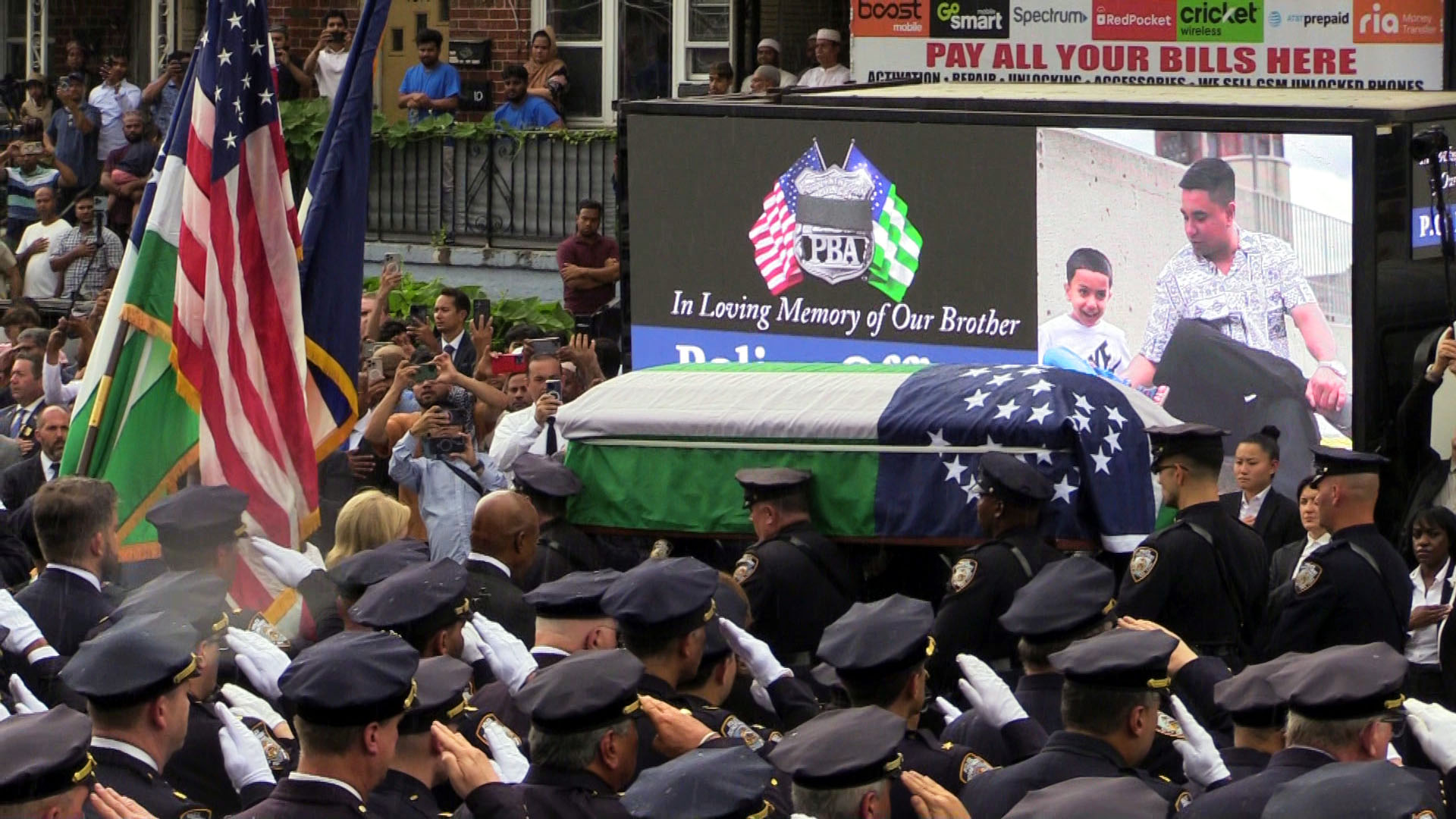 Back at the funeral, NYPD pallbearers carried the NYPD flag-draped coffin across Virginia Avenue to White Plains Road and into a waiting white hearse, while thousands of officers lined the street. Family and friends followed the casket, and just as the hearse made its way to White Plains Road, the rain started to fall.