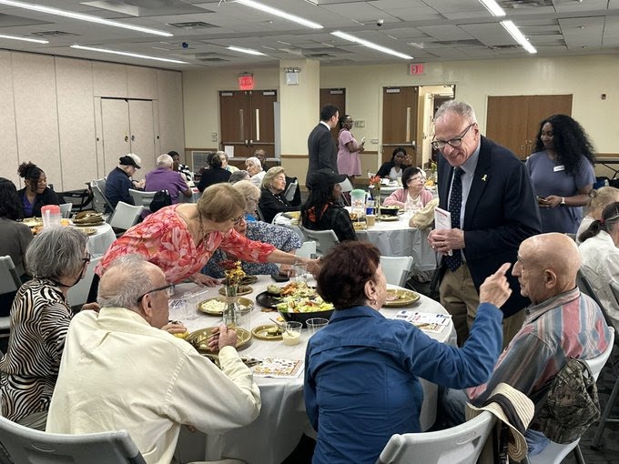 ASSEMBLYMAN JEFFREY DINOWITZ (right, standing) and Councilman Eric Dinowitz (background left, standing) join attendees and other officials from Selfhelp Community Services which hosted its latest “Coffee House” event for Holocaust survivors at the Hebrew Institute of Riverdale on Thursday, Sept. 18, 2025