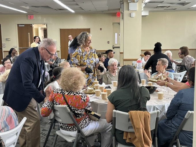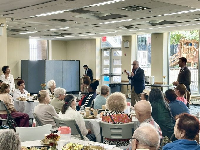 ASSEMBLYMAN JEFFREY DINOWITZ (standing) and Councilman Eric Dinowitz (not pictured) join attendees and other officials from Selfhelp Community Services which hosted its latest “Coffee House” event for Holocaust survivors at the Hebrew Institute of Riverdale on Thursday, Sept. 18, 2025