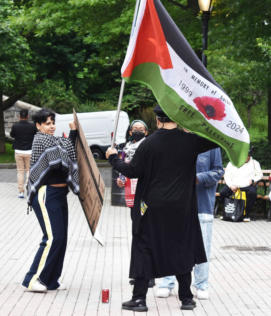 At one point, a few protestors carrying a sign which included the wording “Please sign the anti-genocide pledge” and who were holding a Palestinian flag and a Pride flag interrupted the councilman, who is Jewish, and appeared to question how the referenced funding would be allocated. The group are also heard in a video asking Dinowitz something to the effect of “What about the queer youth of Palestine?” Dinowitz is seen responding to the group but as he had already handed the mic to MPC, his response cannot be heard.