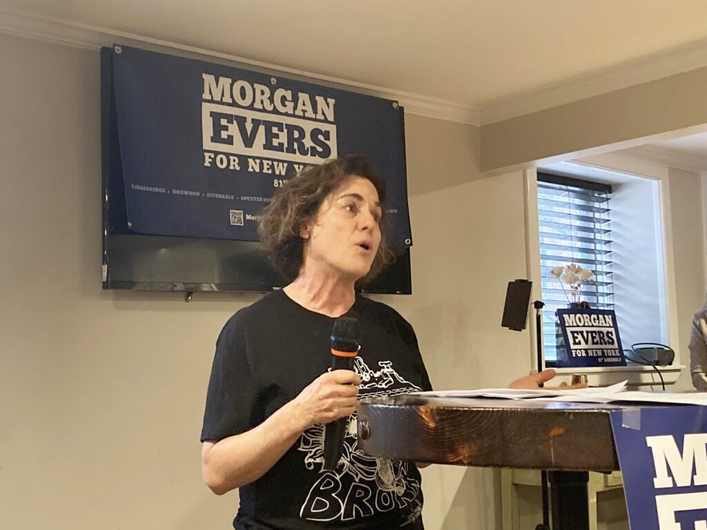 MORGAN EVERS, TEACHER and activist, launches her campaign for State Assembly in the northwest Bronx assembly district 81 covering some or all of Norwood, Bedford Park, Kingsbridge, Wakefield, Woodlawn, Riverdale, North Riverdale, Fieldston, Mosholu, and Spuyten Duyvil on Sunday, Dec. 7, 2025 at Connaughton’s Steakhouse in North Riverdale in the company of various supporters including the Unity Democratic Club. Video by Síle Moloney